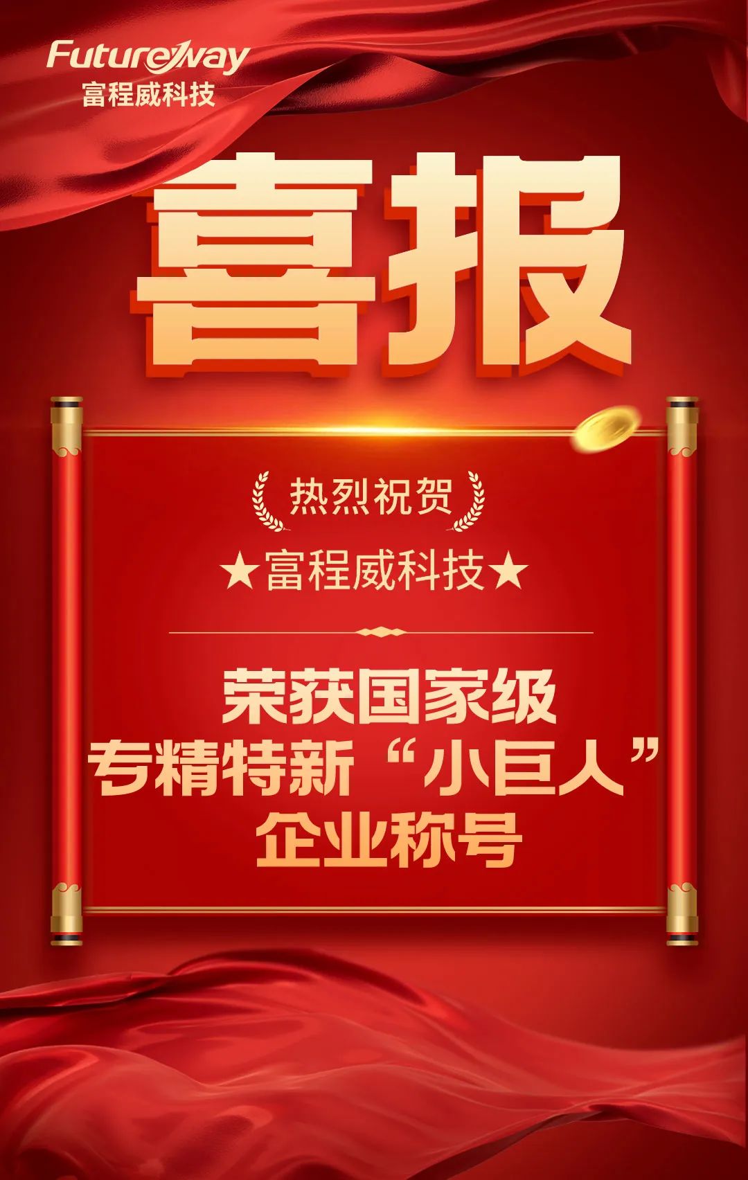 本次荣登“国家小巨人”行列,是国家对富程威研发实力、创新能力以及市场规模等多方面的认可,是对企业坚持走自主创新之路,潜心钻研前沿先进技术的肯定,标志着富程威的企业综合实力迈入新台阶,踏上新征程!
